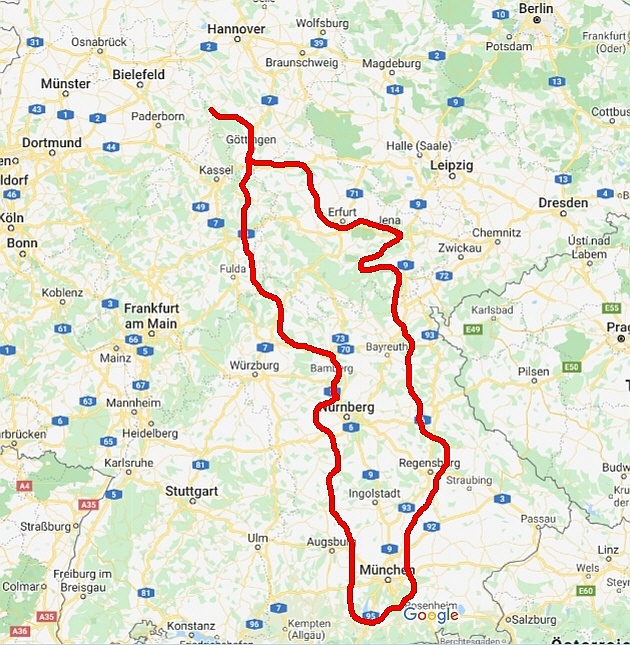 B3 Einbeck-Northeim A7/A38 bis Friedland-B27 Witzenhausen-Bad Sooden Allendorf-Sontra Bebra-Bad Hersfeld-Hünfeld-Fulda-Motten-Bad Brückenau-B286 Richtung Bad Kissingen-Wildflecken Camping Kreuzberg 1 Tag aufenthalt....Oerlenbach B19-Schweinfurt-B26 Untertheres-Knetzgau-Sand am Main-B26 Dippbach-Trunstedt-Feigendorf-Debring-B22 Bamberg-Höchstadt-B470 Neustadt Aisch-Rügland-Ansbach-B2 Donauwörth-B16 Rain-Münster-Thierhaupten-Rehding-B2 Mering-Landsberg Lech-Wessobrunn-Autdorf-Bad Heilbrunn-Bad Tölz-Ellbach-Kirchbichl-Obermühltal Holzkirchen.... Rückfahrt: Holzkirchen-Aying-Ebersberg-B12 Haag-B15 Dorfen-Landshut-Neufahrn-Abendsburg Saal-Kelheim-Dietfurth-Beilengries-B299 Neumarkt-Gebertshofen-Happung-Auerbach-B85 Pegnitz-Creussen-Bayreuth-B85 Kulmbach-Stadtsteinach Campingplatz....Marktrodach-B305 Kronach-B89 Sonneberg-Neuhaus-Katzhütte-Allzunah--->Bunkermuseum besucht...Oberhof-Ohrdruf-B88 Friedrichsroda-Eisenach-B7 Creuzburg-B27 Bad Sooden-Witzenhausen-Friedland-A38/A7 Göttingen-B3 Northeim-Einbeck-Alfeld...